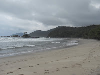 Po kilkugodzinnej podróży autobusem z Paraty do Sao Sebastiao i półgodzinnej przeprawie promem, znaleźliśmy się na Ilhabela. Wyspa jest jednym z ulubionych miejsc mieszkańców Sao Paulo na spędzenie weekendu, podobno w sezonie trzeba nawet rezerwować miejsce na promie dla samochodu, ale my byliśmy pieszo i przed pełnią sezonu, więc prom nawet nie był aż tak pełen. Ilhabela to typowo turystyczna wyspa z kilkoma resortami, pięknymi plażami i atrakcjami dla żadnych przygód. My skusiliśmy się na wycieczkę jeepem na oddaloną plaże Praia de Castelhanos, która uważana jest podobno za jedną z 10 najpiękniejszych plaż Brazylii. Nie powiem, plaża imponująca, niestety pogoda niezbyt dopisała (choć i tak nie było najgorzej, bo w Internecie codziennie znajdowaliśmy zapowiedź silnych opadów tropikalnych, a najczęściej kończyło się na krótkotrwałych deszczykach), za to dopisały borrachudos, jakiś rodzaj paskudnych, małych i bardzo upierdliwych komarów czy muszek. Byliśmy kompletnie nie przygotowani, niby przewodnik Lonely Planet coś wspominał o zmorze wyspy, czyli tych właśnie komarach, ale zignorowaliśmy tę informację. W jeepie jednym z pierwszych pytań, jakie nam zadali nasi towarzysze, to czy jesteśmy w posiadaniu preparatu przeciw komarom . Którego nie mieliśmy oczywiście, ale mimo, że nasmarowaliśmy się kremem, którego nam użyczyli, nie uchronił on nas przed atakiem borrachudos. W efekcie moje nogi i stopy były pełne ukąszeń i strupów prawie do końca naszego pobytu w Brazylii. Ale koniec o minusach Ilhabela, która pomijając małych krwiopijców może uchodzić za raj na ziemi.